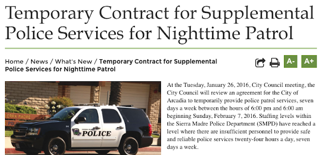 Pretty dire, right? "Staffing levels within the Sierra Madre Police Department (SMPD) have reached a level where there are insufficient personnel to provide safe and reliable police services twenty-four hours a day, seven days a week."