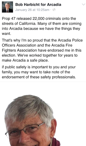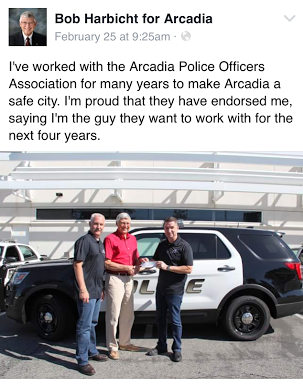 Mod: Bob Harbicht was in office when huge pay and benefits giveaways were presented to various city employee unions. Of course Arcadia's cops support Harbicht. He made them rich. Here are some numbers from Transparent Pasadena (link):