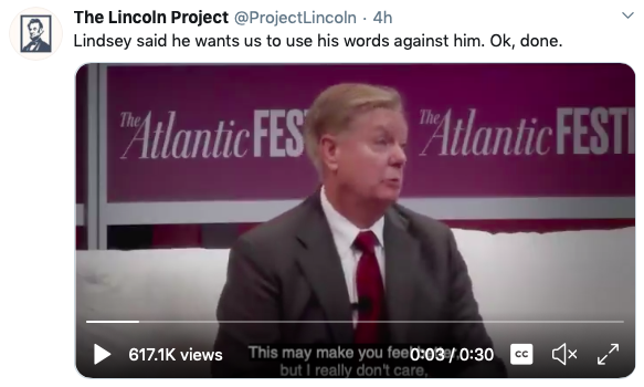 Lincoln Project releases devastating new ad against Republican Lindsey Graham (Raw Storylink): The chair of the Senate Judiciary Committee had his own words used against him in a hard-hitting new ad from the Lincoln Project.