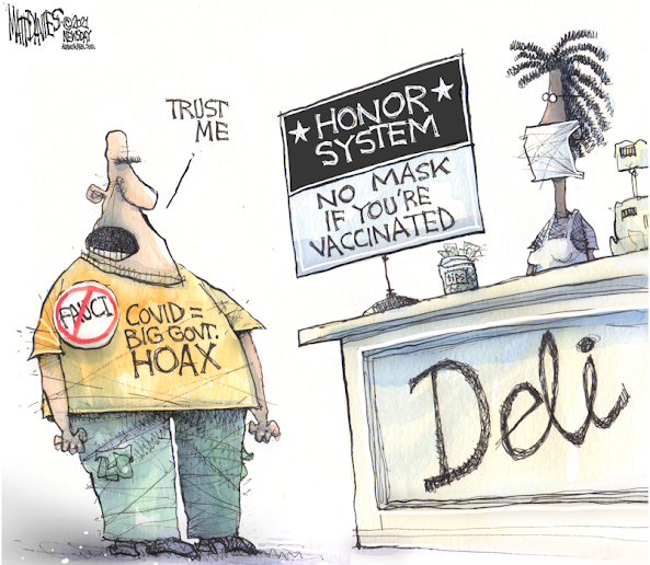 Vaccination data hints at new pandemic phase in which COVID-19 spreads primarily among Republicans (DailyKoslink): In news that still surprises approximately nobody, the newest vaccination data confirms that the race to immunize Americans against a pandemic virus that killed 600,000 people in this country has been thoroughly partisanized. Democratic-leaning communities are getting vaccinated. Republican communities aren't.